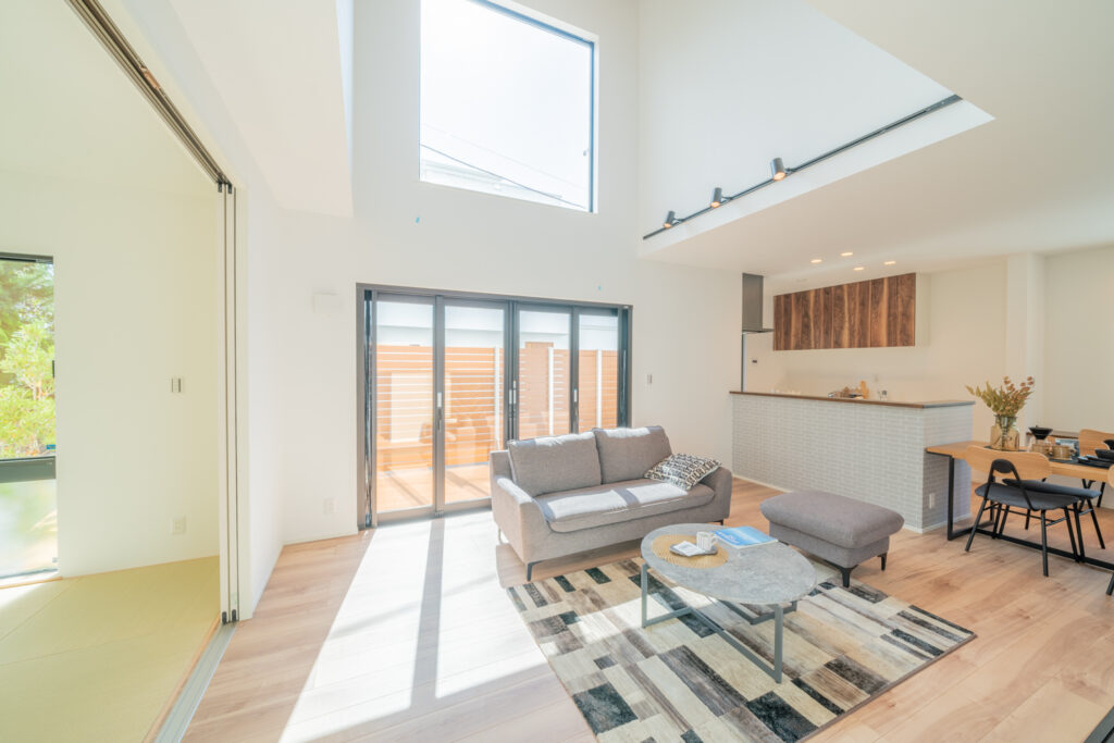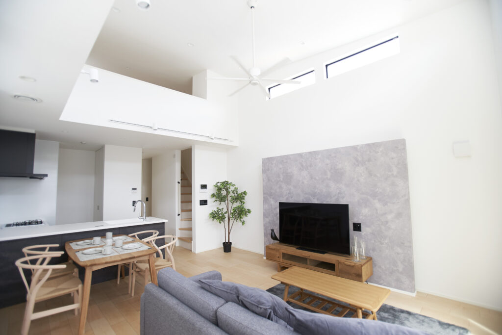 吹き抜けや高天井を取り入れることで、開放感あふれるリビングが実現します。